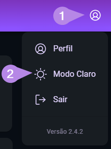 • Para utilizar o modo claro, siga os mesmos passos, clicando no ícone do menu de usuário (1), no canto superior direito da tela, em seguida clique em “Modo Claro”(2).