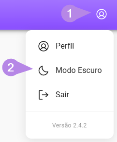 • Clique no ícone do menu de usuário (1), no canto superior direito da tela, em seguida clique em “Modo Escuro”(2).