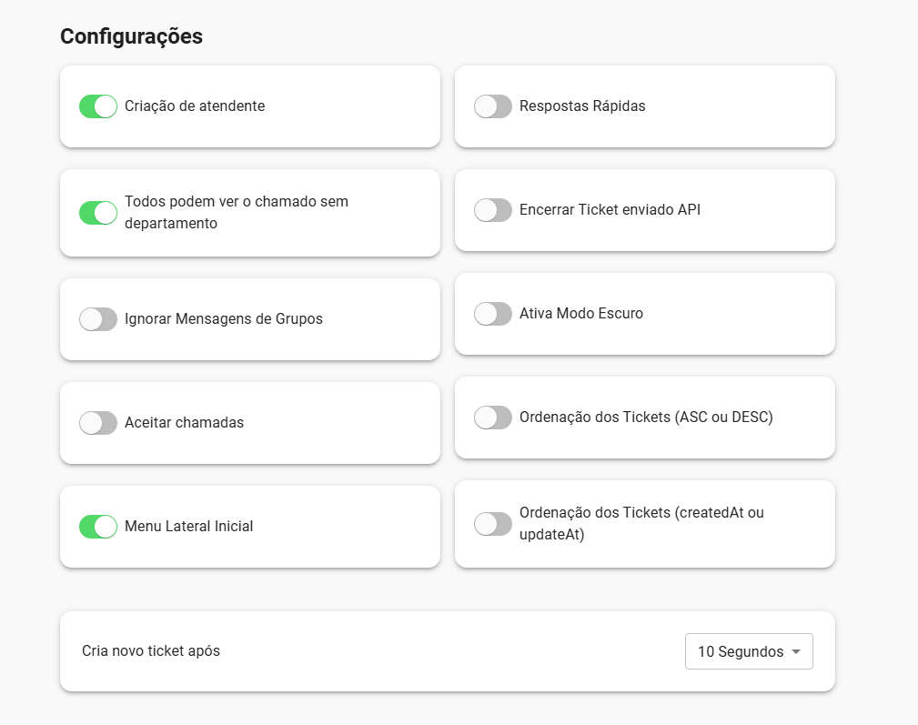 • Criação de Atendente: Quando habilitado, permite a criação de novos atendentes pelos usuários administradores.